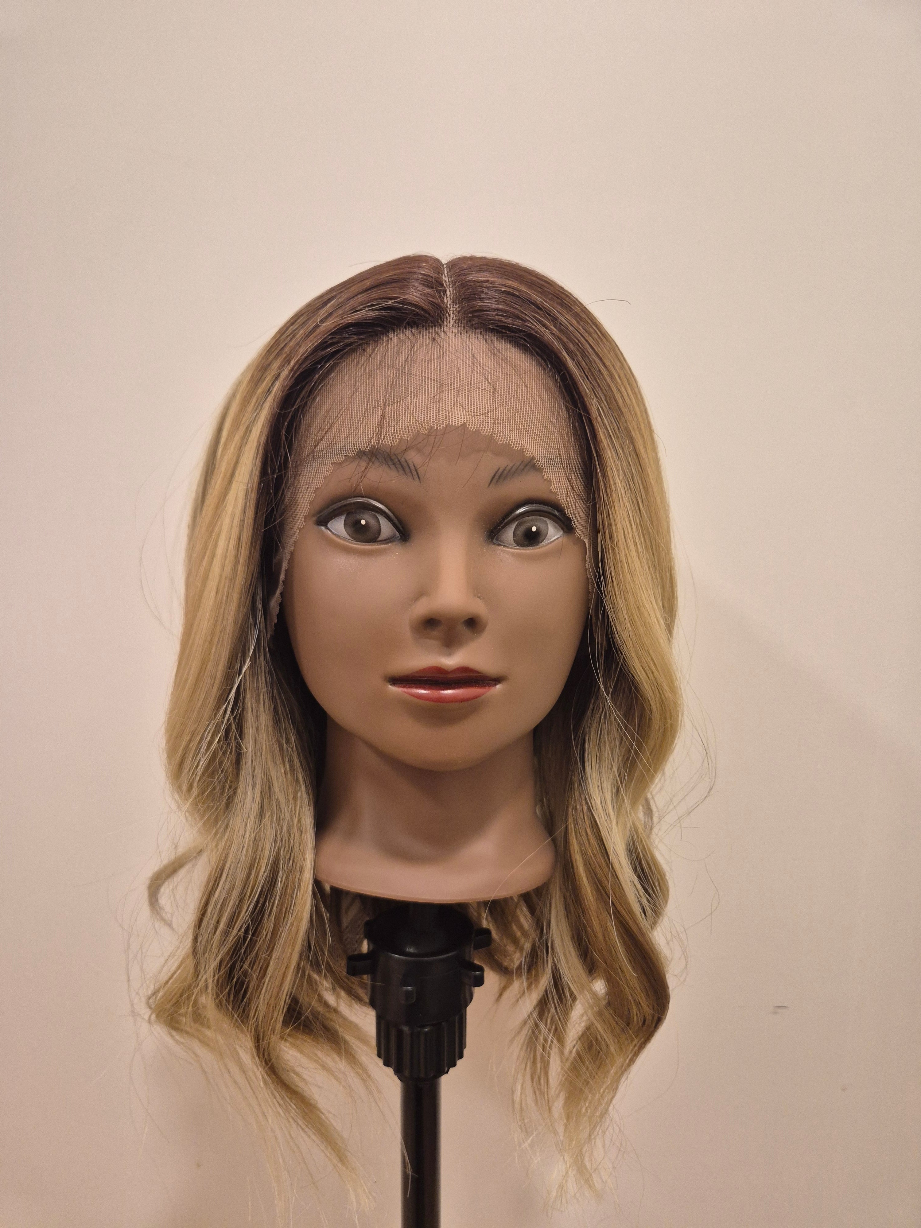Body Wave Long Bob Lace Wig Ombré blonde with darker roots, soft body wave texture Long bob (lob) length, sits at the shoulders Lace front, T-part, natural-looking finish